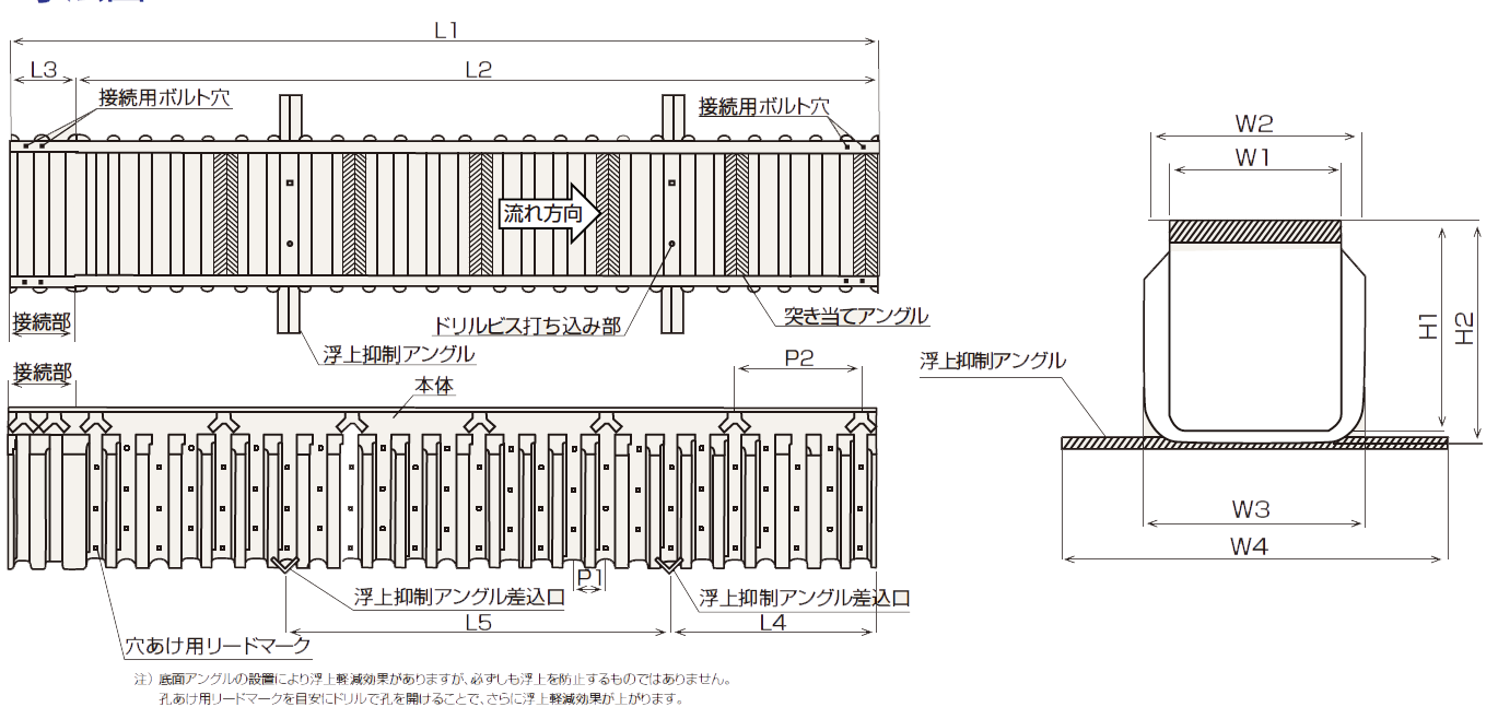 角型フリュームは高密度ポリエチレン製のため、軽量でスピーディーな施工が出来る画期的な製品です。