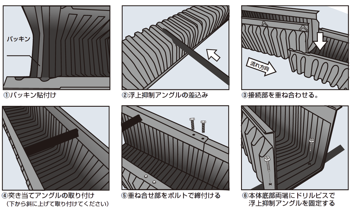 角型フリュームU 字溝は、ワンタッチ組立て方式になっているため、